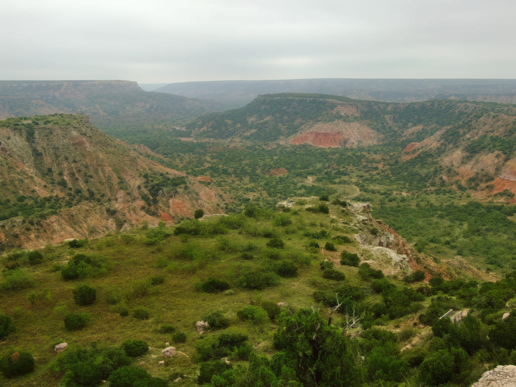 In der Früh zeigte sich eine weniger angenehme Überraschung: Es nieselte und der Nebel hing bis zum Boden. Sowas passiert wohl, wenn es irre schüttet und dann warm wird. Das Internet behauptete, daß das Nieseln bis 10 Uhr und der Nebel bis Mittag weg sein sollte. Also haben wir uns nicht gestresst, haben langsam gefrühstückt und tatsächlich hörte das Nieseln pünktlich auf. Daher haben wir das Zelt eingepackt und sind zum Palo Duro State Park gestartet. Dort war der Nebel zwar nicht am Boden, dafür sah es aber garnicht so sehr danach aus, daß der Nebel bis Mittag weg sein würde. Und so war es auch: Es blieb eine hochnebelartige Bewölkung übrig, die vielleicht bis zum Abend verschwunden gewesen wäre, aber so lange wollte ich auch nicht warten. So präsentiere ich hier eben ein Überblicksfoto mit Hochnebel: