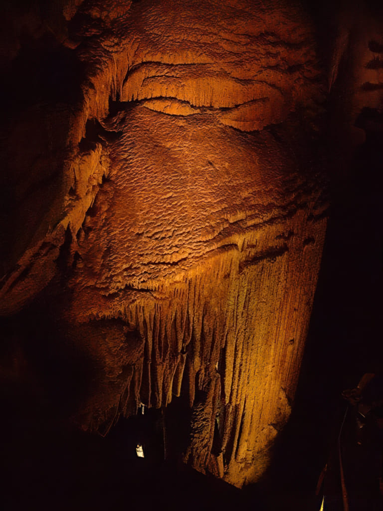 Erst kurz vor einem weiteren gesprengten Ausgang kommt ein Raum mit Dekorationen. Und genau wegen diesem Raum, wurde ein noch neuerer Eingang (vom selben Mienentechniker) gesprengt. Denn früher mußten die Leute 7 Stockwerke runter, 1 Stunde zu Fuß durch die Höhle, 1 Stunde zurück und dann 7 Stockwerke wieder rauf. Und das mit Gegenverkehr. Also ein kleiner Gang von kaum 20m gesprengt und schon war alles einfacher (und nahezu stufenfrei). Im folgenden Bild sehen wir das Topstück der Höhle, den Frozen Niagara Fall: