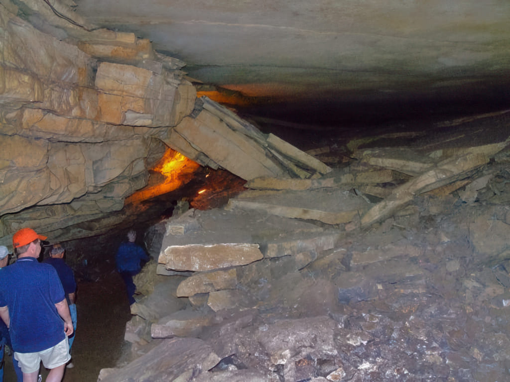 Die Höhle selbst ist keine Tropfsteinhöhle. Eine Sandsteinschicht über der Kalksteinschicht macht die Höhle dicht und trocken. Und wo nix tropft, da keine Tropfsteinhöhle. Dafür ist die Mammoth Cave die längste erforschte Höhle der Welt. Selbst – so sagte man mir hier – wenn man die 2. und 3. größte Höhle zusammenfügen würde, ist die Mammoth-Cave länger. 367mi sind aktuell erforscht und es werden ständig mehr. Dafür ist sie halt nicht so dekorativ; man wandert eine gute Stunde in Höhlen mit Geröll, wie im folgenden Bild halt.