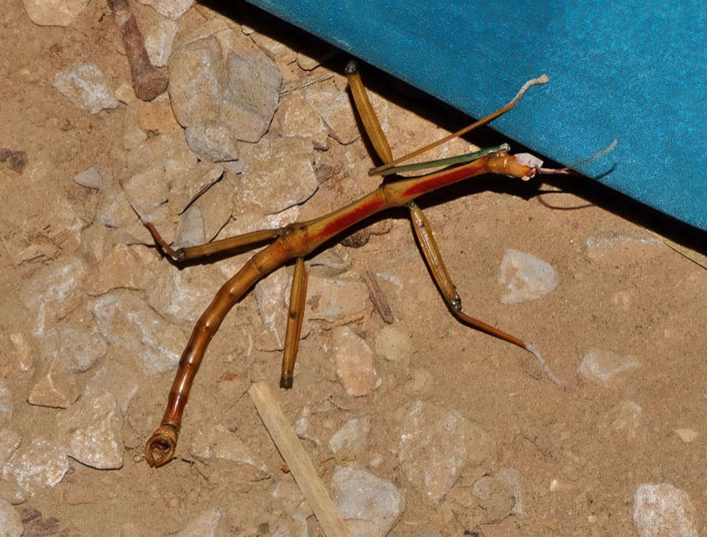 Am Campingplatz wurde wieder einmal der Griller angeworfen und bald wurde es finster (wir sind knapp vor einer weiteren Zeitzonengrenze und da geht die Sonne aktuell schon vor 19 Uhr unter). Und was raschelt da an meinem Zelt? Schon wieder eine Gespenstheuschrecke, aber eine ganz andere (nur kleiner war sie nicht). Seltsam ist bei der das Hinterteil: