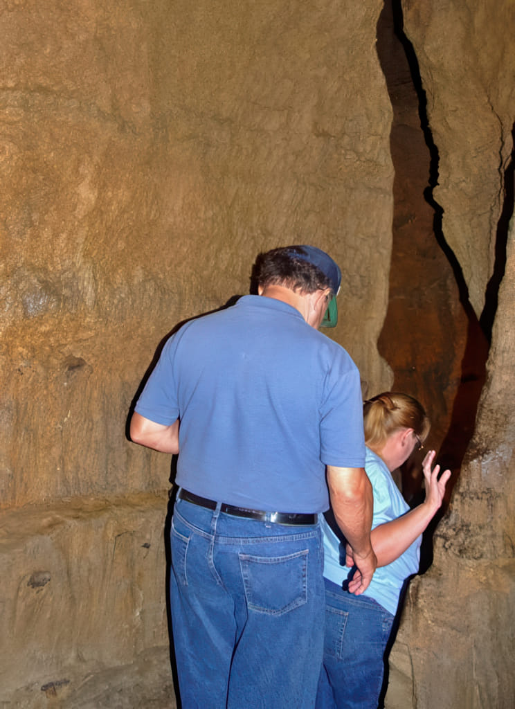 Der neue Eingang hat eine nette Geschichte. Ende des 19 Jhdt. wurde die Cave entdeckt und ein reicher Typ hat das Gelände gekauft. In Kentucky gilt das Recht (und das ist in diesem Fall wichtig), daß der Besitzer eines Grundstückes auch alles darunter besitzt. Der reiche Typ hat angefangen die Höhle zu vermarkten. Gleichzeitig hat er sich einen anderen Typen engagiert, der was von Höhlen versteht (damals einen Mienentechniker). So wurde die Höhle vermessen und zugänglich gemacht. Der Vermessungsplan war jedoch streng geheim, denn zwei Dinge fielen bald auf: Die erforschte Höhle war noch viel kleiner als sie beworben wurde und es schien so, als ob die Höhle unter Fremdgrundstücken weiterging. Also nicht lange reden, trotzdem die Höhle vermarkten.