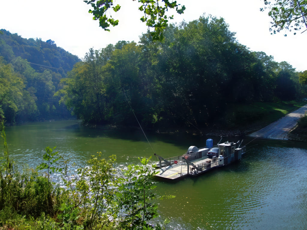 Außerhalb der Höhle kann man noch einiges (vorallem im Sommer) machen. Z.B. Kanu fahren am Green River. Um über den Green River zu kommen, gibt es eine winzige Fähre, die halb so lange wie der Fluß breit ist. Warum da keine Brücke steht, weiß ich auch nicht, aber die Minifähre sieht cool aus. Vorallem der Antrieb, ein einseitiges Paddelrad (im Bild links Mitte)!