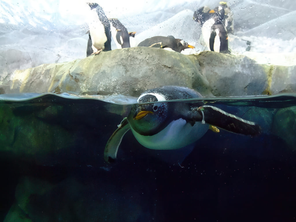Weniger weil es zum Ocean so gut paßt denn mehr weil es hier im Süden wohl selten ist, ein Abteil für die Pinguine (die auch sehr beworben werden). Das Wasser hat leichten Wellengang und die Pinguine glotzen neugierig die Besucher an; so wie dieser hier.