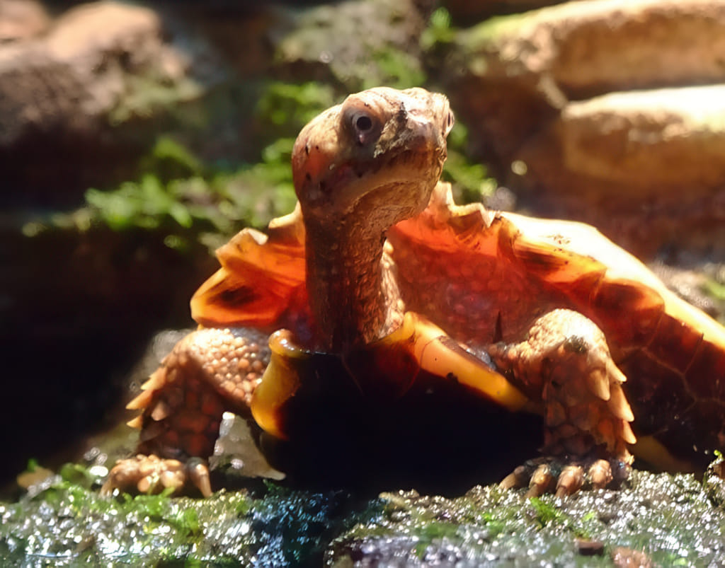 Überraschend viele Schildkröten aus aller Welt sind im Aquarium zu sehen. Diese asiatische Schildkröte war wohl das Vorbild für ET. Mein grünes Fokuslicht hat sie jedenfalls sehr interessiert und irgendwie sieht sie ganz und garnicht entspannt aus.