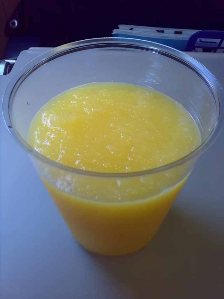 Der britische Frühstücks Orangensaft war nicht nur bitter, sondern auch sehr ‚frisch‘, man könnte auch gefroren sagen. Ich habe ihn dann in den Becher gebrochen. Orange Slush eben:
