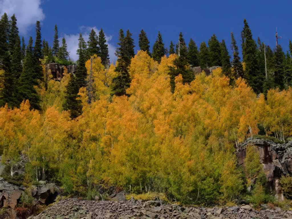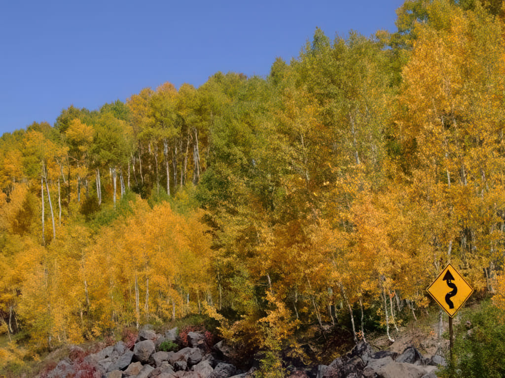 Von Grand Junction ging es zunächst auf dem Highway nach Delta, wo ein Einkauf am Programm stand. Der Walmart war schnell gefunden, TomTom wußte Bescheid und der Walmart lag auch direkt an der Straße. Von nun an ging es steil bergauf und die Temperatur sank wie vorhergesehen (der Gipfel liegt über 3000m hoch) ins Bodenlose. Drum zeigten sich auch bald die ersten gelben Bäume: