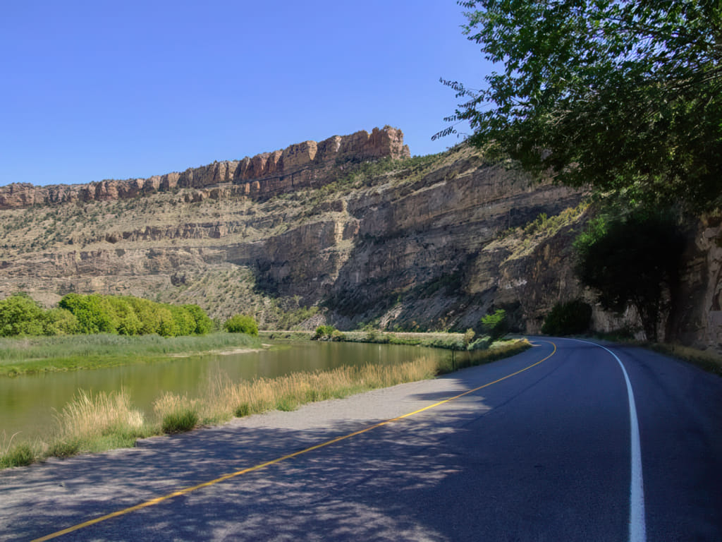 Der Byway endet direkt an der I70, wo wir weiter Richtung Osten gedüst sind. Da wir die guten 200mi eigentlich bald geschafft haben wollten, haben wir eine Pause auf einem mit ‚Parking‘ gekennzeichneten Platz gemacht. Wir waren nicht schlecht überrascht, daß die Interstate in einem Tunnel verschwand und wir dem Fluß folgten. Parking? Und wie ging es weiter? Des Rätsels Lösung ist einfach: Sie haben den alten Highway einfach zu einer Einbahn gemacht und als Parkgebiet deklariert. So konnte man entlang des Flusses überall parken, während die Interstate die Abkürzung durch den Tunnel nimmt. Hier ein Blick auf die doch idyllische Landschaft: