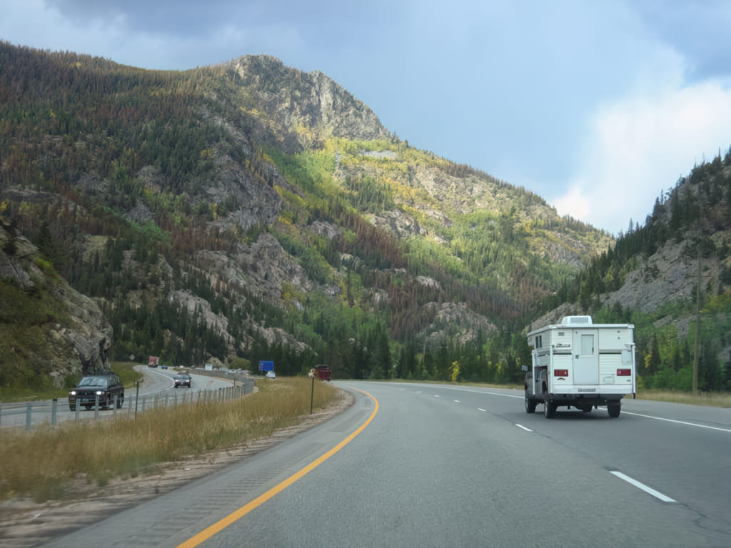 Und dann geht es in die Höhe. Keine Ahnung wie hoch (da haben sie plötzlich auf die Höhenangaben ‚vergessen‘) aber 3000m werden es wohl schon gewesen sein. Mit einer Interstate! Vail, Beaver Creek und Co lagen an der Interstate. Die Steigungen waren für eine Autobahn auch nicht schlecht (>6% über viele Meilen):