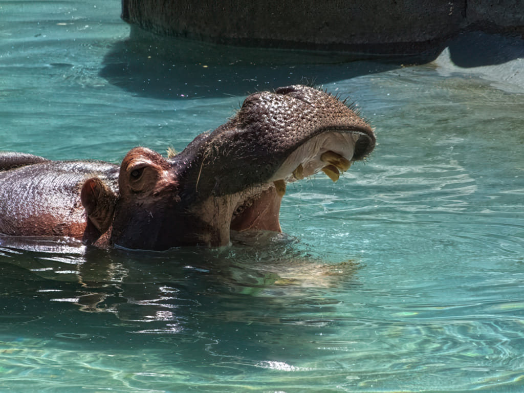 Das einzige Hippo ist bei dem warmen Wetter nicht aktiver als alle anderen seiner Gattung. Nur für mich hat es eine Ausnahme gemacht und hat sein Maul aufgerissen: