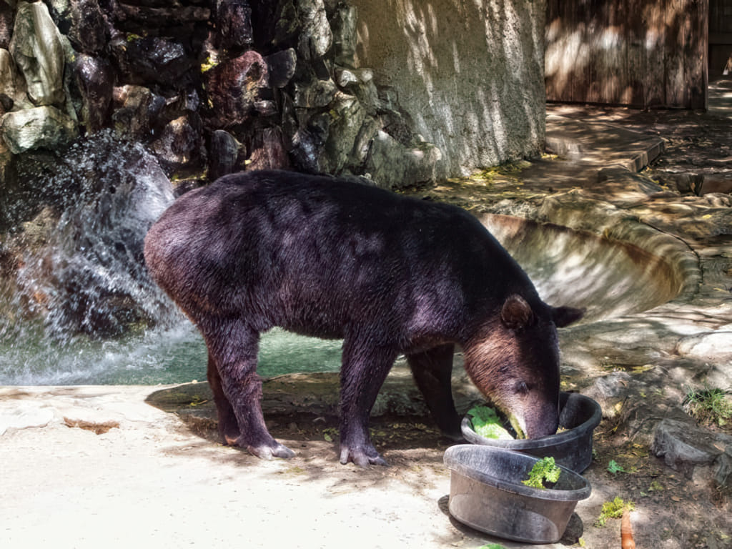 Die Tapire in Wien sind ziemlich nackt und angeblich (zumindest wie ich zuletzt dort war) gemein. Man soll sehr aufpassen und Wärter wären immer gefährdet. Diese hier sind völlig wuschelig behaart (weil Bergtapire) und total kuschelig. Nicht nur im Aussehen, nein, die Wärter haben sie bei den Reinigungsarbeiten gestreichelt und einer der Tapire hat mächtig gebettelt. Waren eher Haustiere als gefährliche Bestien (das mit dem Wasser sieht zugegebenermaßen blöd aus, aber Zufälle gibt es, für die kann ich nichts):