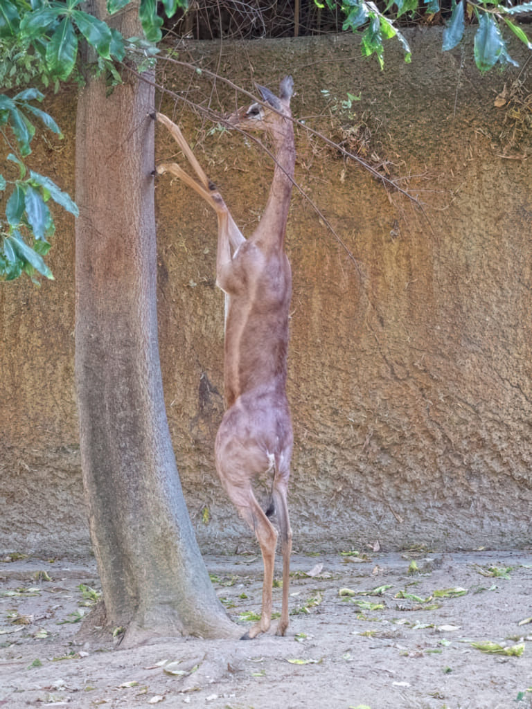 Die Windspiele unter den Gazellen schauen sehr zerbrechlich aus und rasen durch den Käfig, daß man nicht mehr an heile Knochen glauben kann. In der Stellung zum Bäume abfressen ähneln sie aber mehr Gottesanbeterinnen: