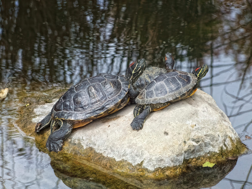 Die Schildkröten im Teich wärmen sich in den ersten Sonnenstrahlen des Tages: