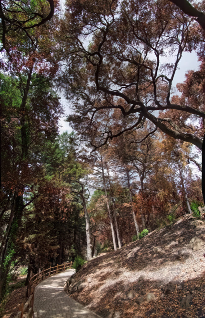 Die ganze Seite mit dem Aquädukt zur Mission ist verbrannt und gesperrt. Der Weg zum alten Damm ist zwar offen, die Bäume sind jedoch zum Teil ziemlich mitgenommen.