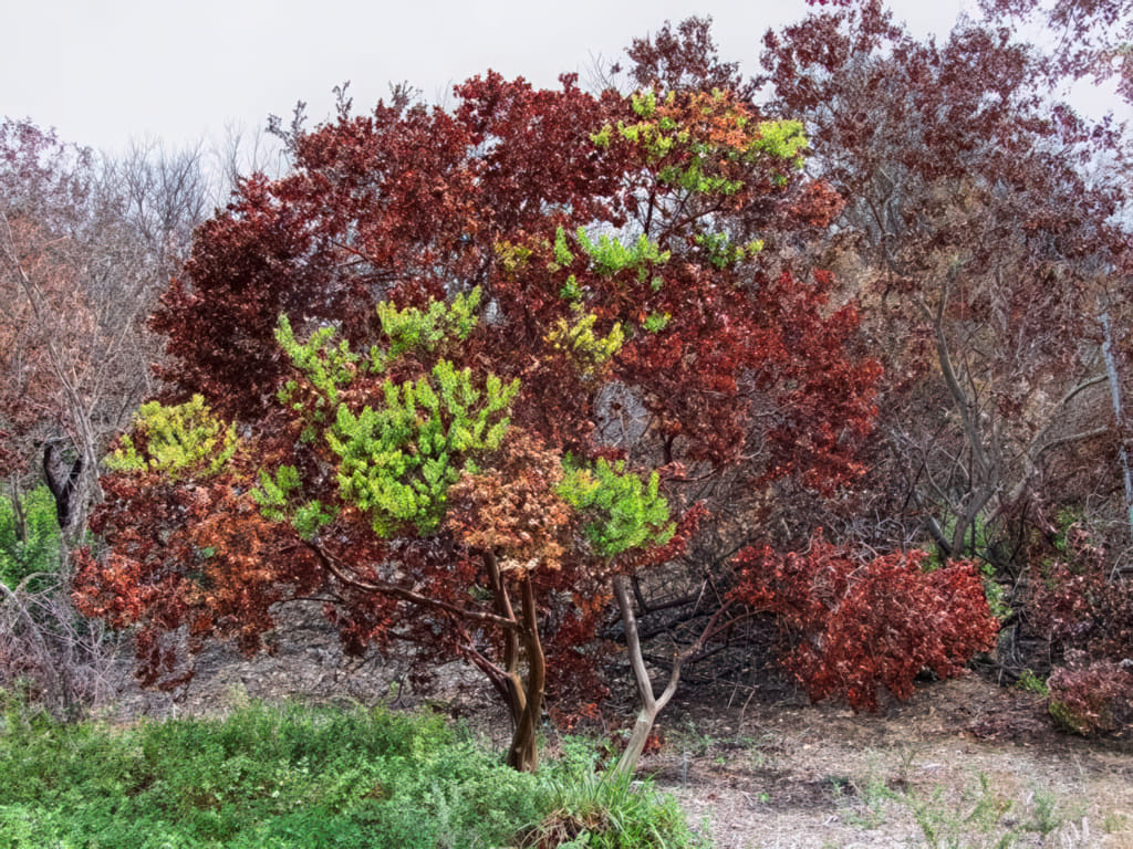 Überraschend ist auch, daß ein verbrannter Baum noch lange nicht tot sein muß. Im botanischen Garten gibt es einige Beispiele von extremen Lebenswillen: