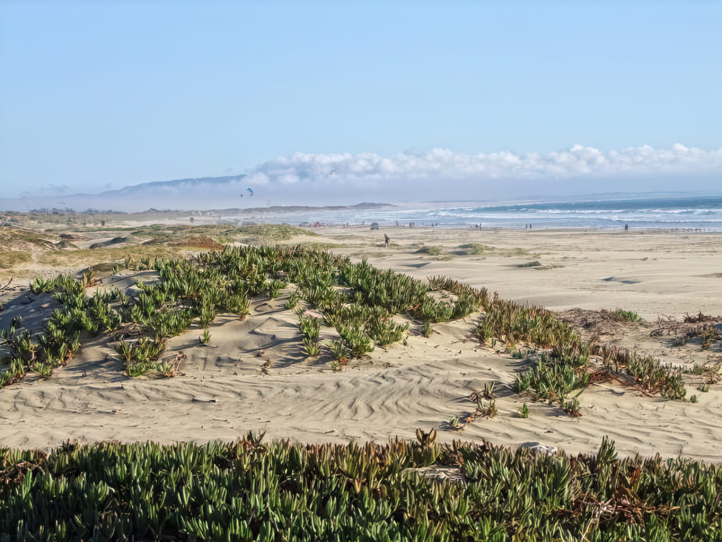 Danach ging es weiter auf der US #1 in Richtung Norden. Weit war es nicht, da wir noch eine Nacht auf einem State Beach verbringen wollten. Dieses mal war es Pismo Beach. Dort wächst am Strand wieder das Grünzeug von Griechenland und Santa Barbara, es blüht aber lila: