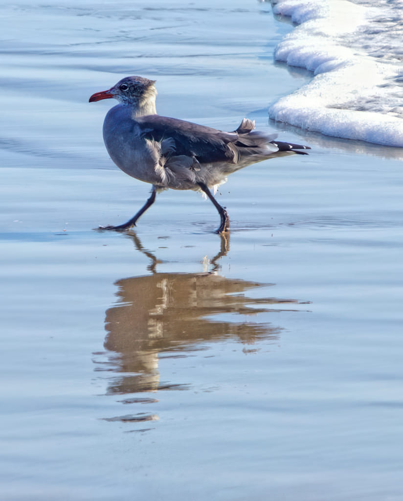 Die Möwen sind dort irgendwie wasserscheu. Sie laufen vor den Wellen hin und her, gehen aber nicht ins Wasser. Wenn der kräftige Wind von schwanzwärts bläst, zerzaust es einem ein wenig das Gefieder: