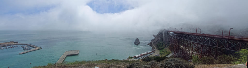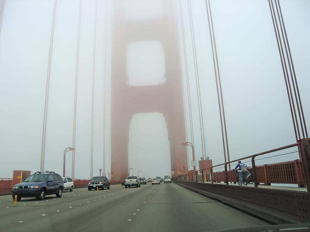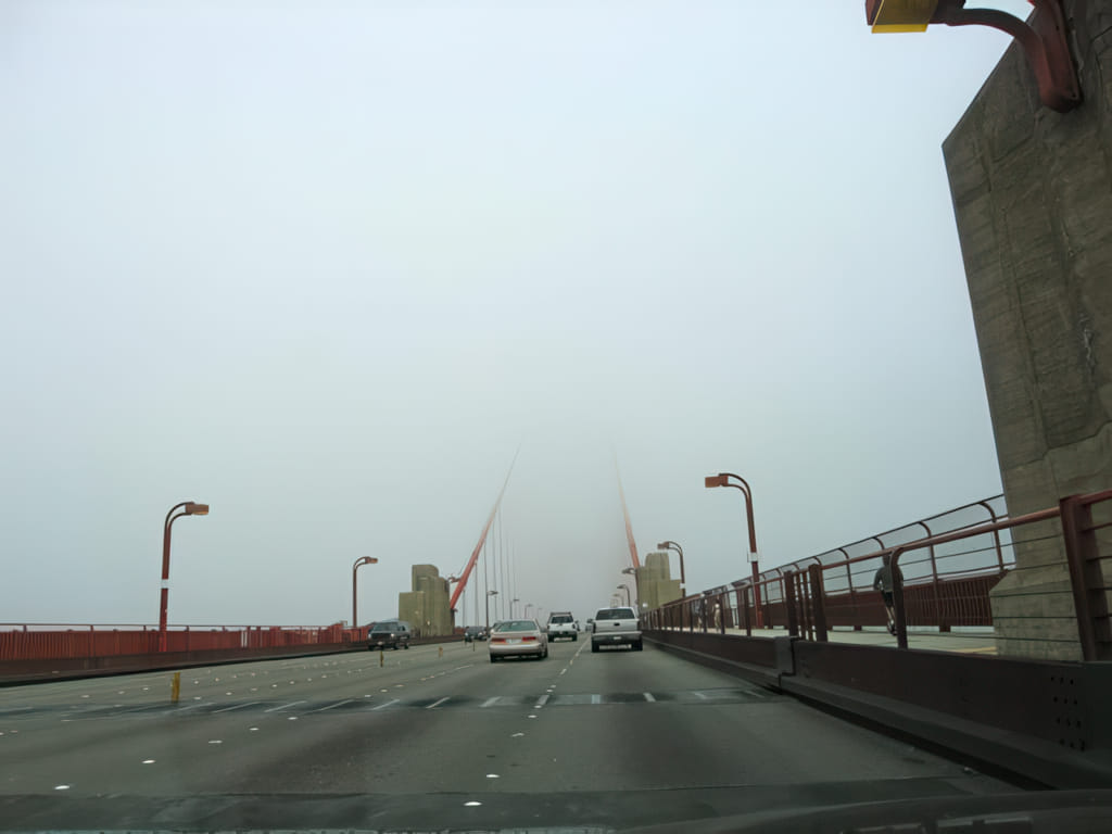 Der Nebel des Grauens war auch auf der weiteren Fahrt bestimmend. Manchmal zeigte sich die ungetrübte Sonne, manchmal gewann der Nebel. Die Einfahrt nach San Francisco gestaltete sich unerwartet unproblematisch, nicht der geringste Stau war zu finden. Leider fand sich aber in Küstennähe der Nebel und so war die Überfahrt über die Golden Gate Bridge (eine Premiere für mich) ein nebliges Ereignis:
