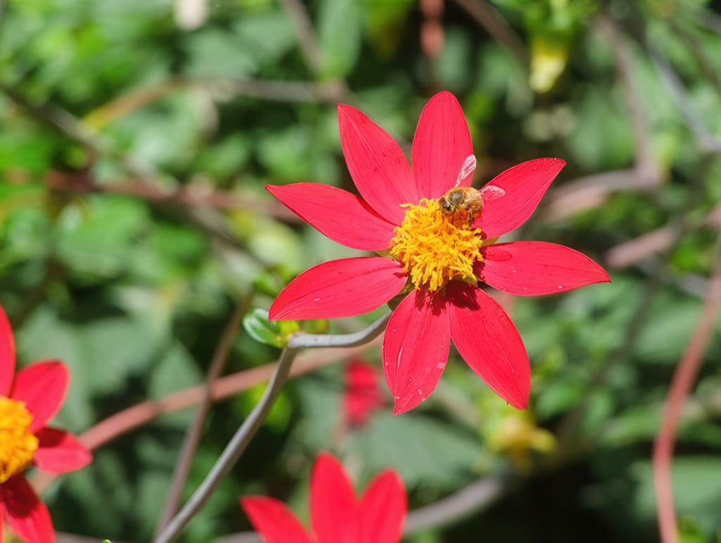Die Glashäuser sind winzig klein, aber das ist auch schon der einzige Nachteil dieses Gartens. In einem Glashaus haben sie einen einsehbaren Bienenstock. Daher wundert es wenig, daß auf den Blumen auch Bienen zu finden sind: