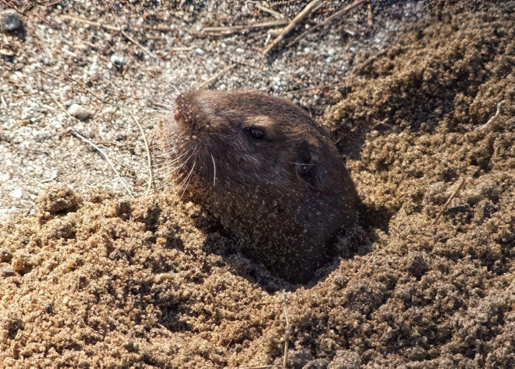 Die Nacht auf der Tanzfläche, oder was das Ding auch immer sein sollte (siehe Post über seltsame Campingideen) war zugegebenermaßen gemütlich (weil der Boden sehr eben war). In der Früh wurden wir von strahlendem Sonnenschein geweckt. Wir hatten also Glück, der Nebel war nur einige 100m entfernt auf dem Meer. Das sonnig warme Wetter muß auch der Gopher bemerkt haben, denn er fing vor meinem Auto ungeniert an seine zerstörten Löcher wieder zu reparieren. So kam ich also in den Genuß, den Täter der Verwüstung zu sehen: