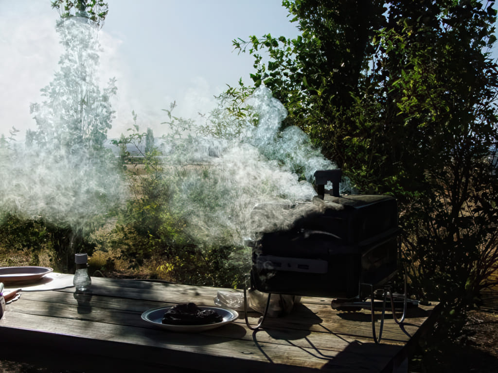 Zurück am Campingplatz ging es munter ans Grillen. Der neue Weber Grill ist echt fantastisch: Man kann sowohl die Kohlebelüftung mit zwei Schiebern einstellen als auch die Abluft an zwei Stellrädern im Deckel. Ich hatte bisher noch nie einen so guten Minigrill. Leicht ist er halt nicht, aber ich will ihn ja auch nicht im Flugzeug transportieren, der bleibt schön hier in den USA. Übrigens sollte man Weber Grills, wenn es geht, in den USA kaufen, denn der Preisvergleich Amazon.com und Amazon.at ist erschütternd: In den USA mehr als 50% billiger!!! Hier ist das gute Ding voll in Action: