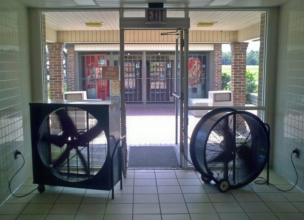 Bisher kannte ich gar keine und mit Ventilatoren in den Fenstern (Klimaanlage ist eher unüblich). Was macht man aber, wenn es dort wirklich warm ist, man aber die Ventilatoröffnungen vergessen hat? Man stellt welche zur Türe. Damit man die nicht klauen kann, kettet man die an. Aber was macht man, daß man sie nicht übersieht und drüber stolpert? Naja, man macht sie größer: