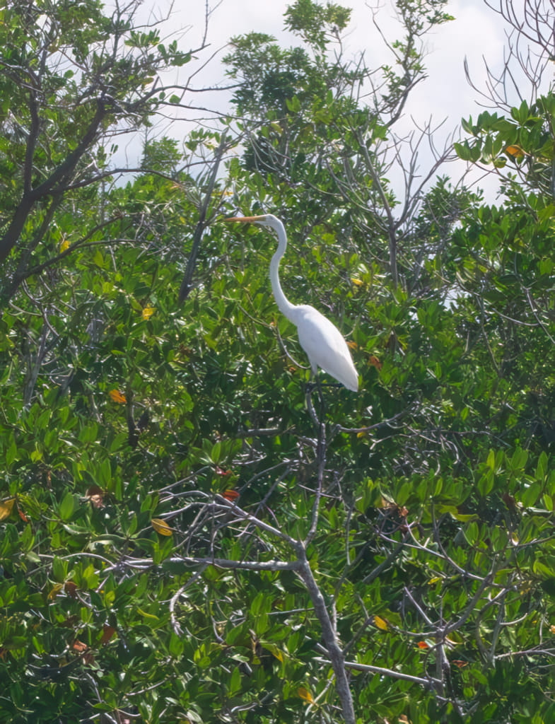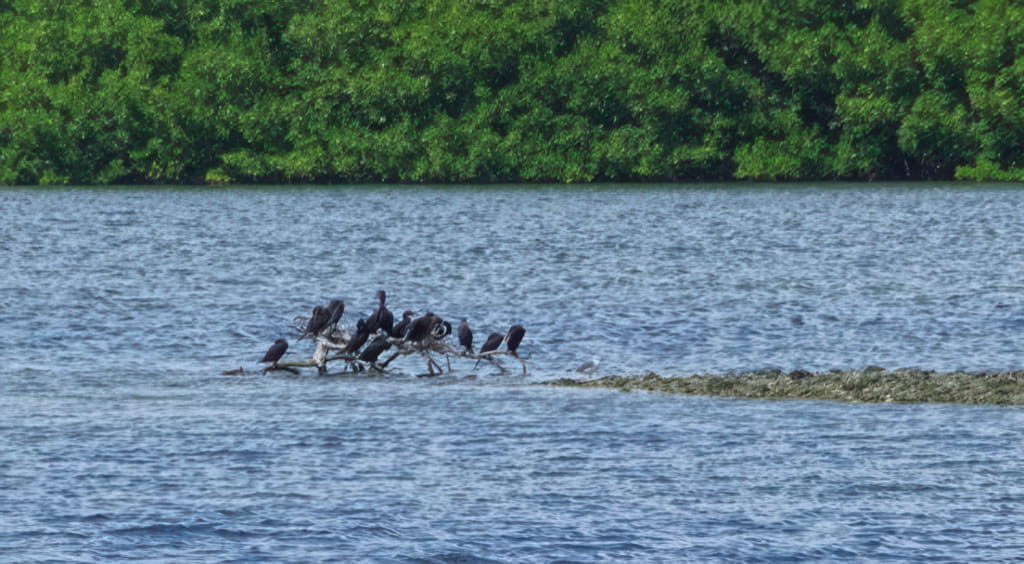 Der Hafen ist nicht direkt am Meer, sondern ist über einen Kanal mit dem offenen Meer verbunden. Da das Schiff ein ziemlicher Brocken ist, darf es im Kanal nur recht langsam fahren. Nicht weil es die Mangroven stören würde, aber die anderen Boote könnten dezimiert werden. Am Kanal sind auch noch einige Vögel zu sehen: