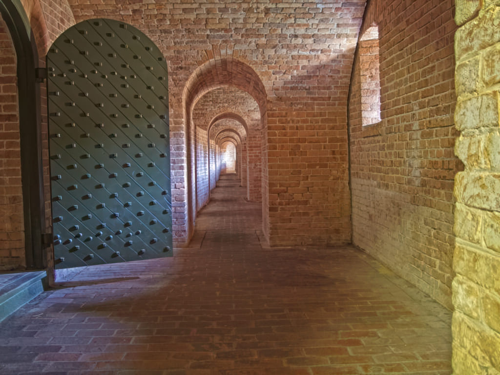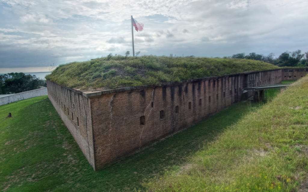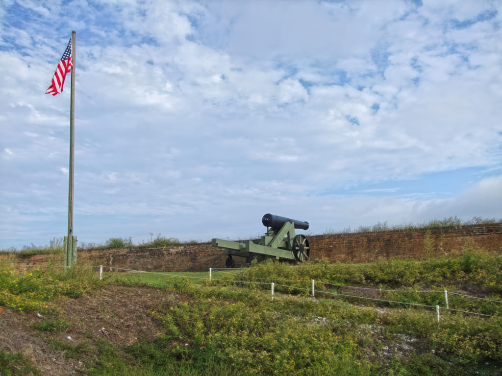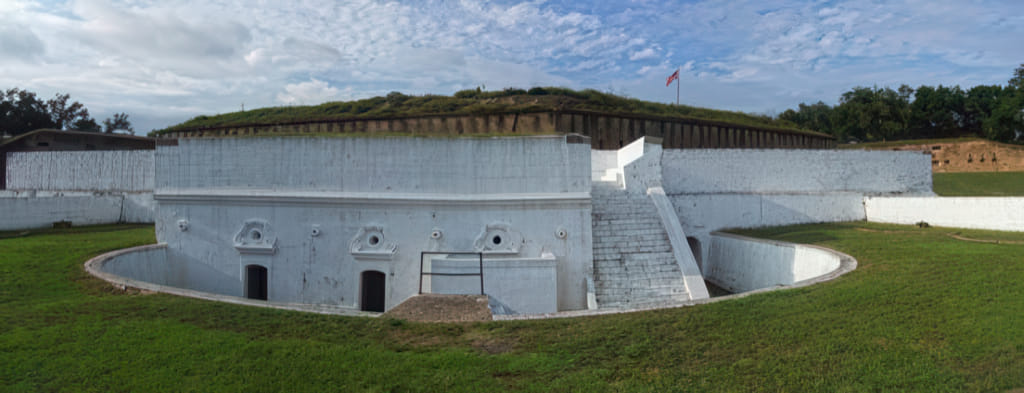 Da ich schon den heiligen grünen Zettel für die AFB hatte, bin ich auch noch schnell zu den anderen Sehenswürdigkeiten gefahren, die sich ebenfalls auf dem Gelände befinden. Das Fort Barrancas NM zeigt eines der Forts aus einer Serie, die die Ostküste beschützen sollte. Dieses Fort war gut gebaut und steht auch heute noch. Leider sind die Öffnungszeiten mit 4:45pm ziemlich begrenzt. Ich war daher beim Rundgang eher im Stress. Fangen wir also ganz schnell beim landeinwärts liegenden Eingang an. Wie man sieht hat sich auch die Sonne ein wenig Platz gemacht: