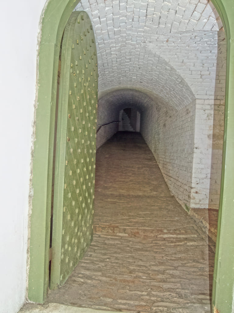 Das Fort hatte einen Vorbau, der die erste Reihe der Kanonen beherbergte. Der Zugang dazu war unterirdisch über einen schmalen Gang. Zunächst der Blick zurück vom Vorbau auf das Fort: