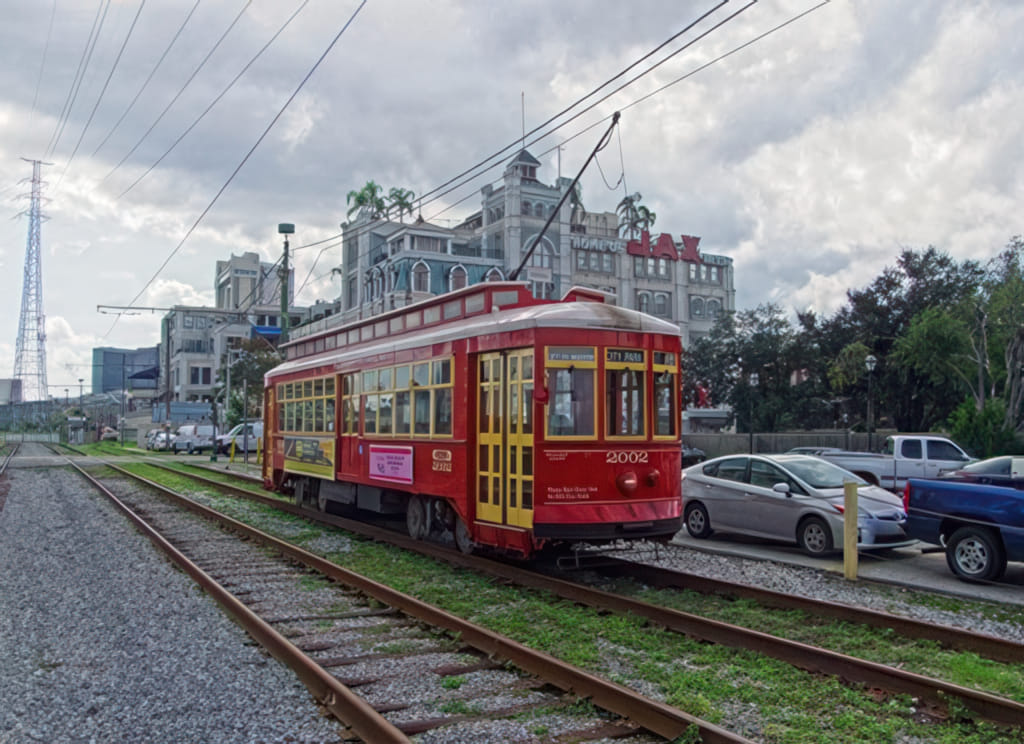 An der Riverfront ist wie immer die Oldtimerstraßenbahn unterwegs: