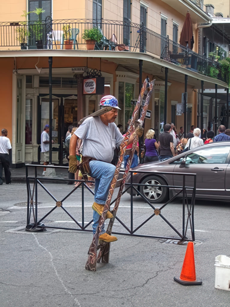 Generell scheint es in New Orleans aufwärts zu gehen. Man sieht wieder sehr viele Touristen, die Lokale sind gut besucht und auch Straßenkünstler sind wieder in größerer Anzahl zu sehen. Die Wolken konnten die Touristen nicht schrecken und es war daher im Zentrum sehr belebt. Man mußte schon ein wenig rumlaufen um die Häuser ohne Menschenmassen fotographieren zu können. Gegen Autos konnte man sich ohnehin kaum wehren: