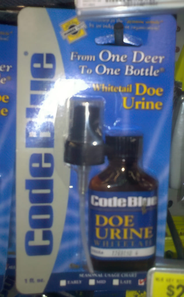 Wieder bei Walmart, dieses mal in der Jagdabteilung: Da kann man in ebensolchen kleinen Fläschchen etwas kaufen, daß ich einmal mehr nicht fassen kann: Reh-Lulu. Auch die Werbeaufschrift quasi direkt vom Reh in die Flasche begeistert mich jetzt voll.