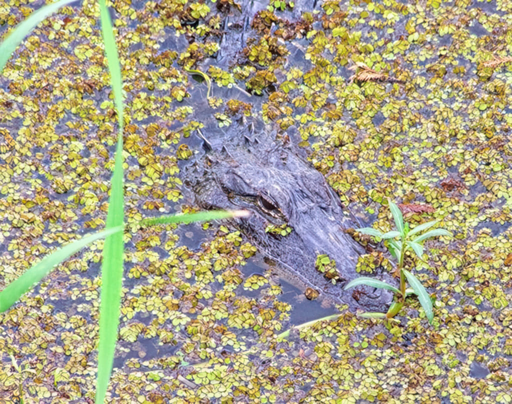 Nach einer anderen Brücke (und damit der Grenze) zu Texas kommt man zum Welcome-Center, das auch als Visitor-Center zum anliegenden Sumpf dient. Wobei anliegend ist nicht ganz richtig, denn das Gebäude steht auf Stelzen mitten im Sumpf. Im Sumpf gibt es auch Alligatoren, auf die sie sehr stolz sind: