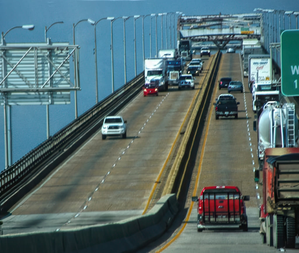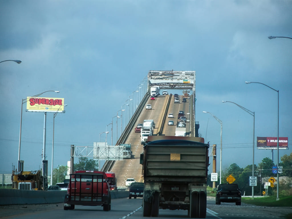 Zunächst ging es auf wieder trockener Straße auf der Interstate in den Westen. Bei Lake Charles ist immer noch die stinkende Chemieindustrie am Werken und die Brücke ist immer noch eine Überraschung wert: Wo sieht man sonst mitten in der Ebene so einen künstlichen Berg mit so einer heftigen Steigung: