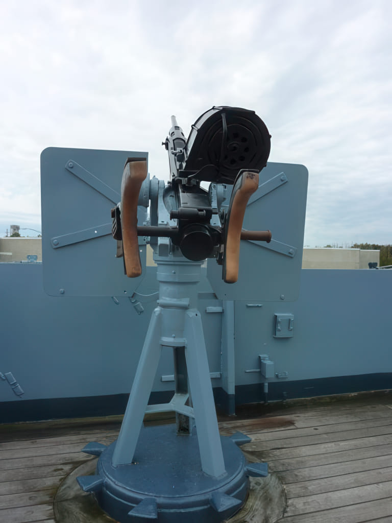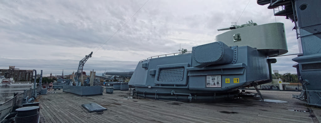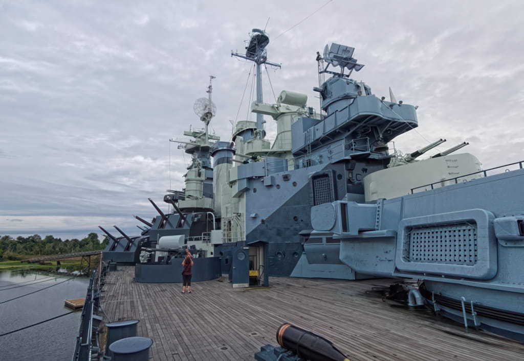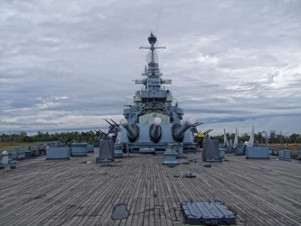 Das Schiff selbst hat auch mehrere Epochen erlebt. Zunächst hatte es Flugzeuge mit Katapulten an Bord, später wurden Riesenkanonen eingebaut und die Flugzeuge hatten keinen Platz mehr. Dann wurde es eingemottet, aber in den 80er Jahren wieder in Betrieb genommen. Jetzt darf es in Wilmington seinem rostenden Ende entgegenmodern. An Deck regiert jedenfalls Holz: