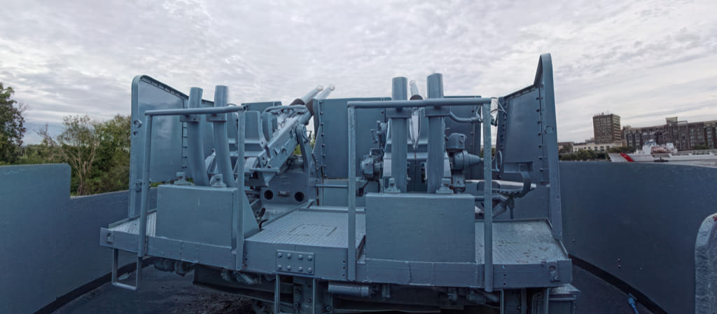 Die ‘große’ Kanone von der Seite. Hinten sieht man die Einstiegslucke, wo man auch heute noch hineinkrabbeln darf. Auf der linken Seite sieht man den alten Kran für die Flugzeuge. Wie gesagt, gemeinsam waren die nie an Bord, ist nur jetzt für die Ausstellung so gemacht worden. Wäre doch zu blöd, wenn man sich seinen eigenen Kran runterschießen würde.
