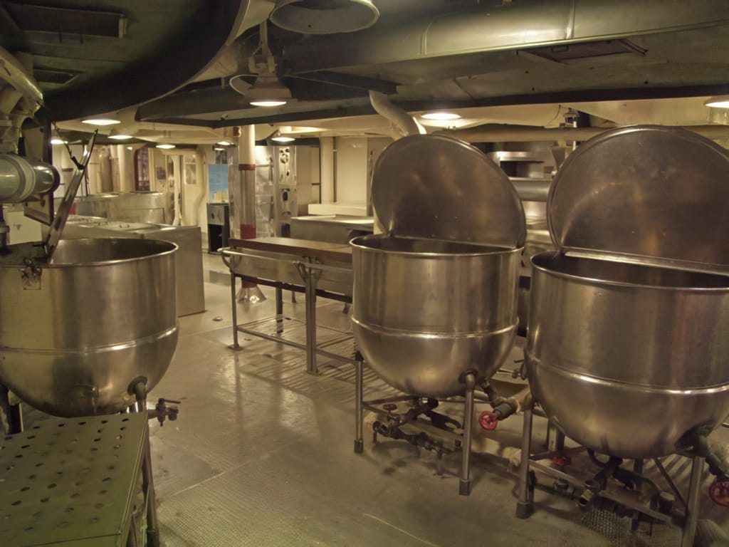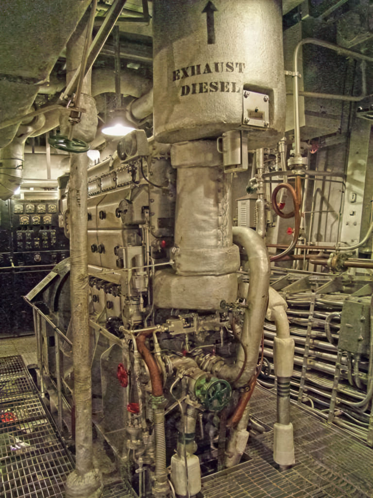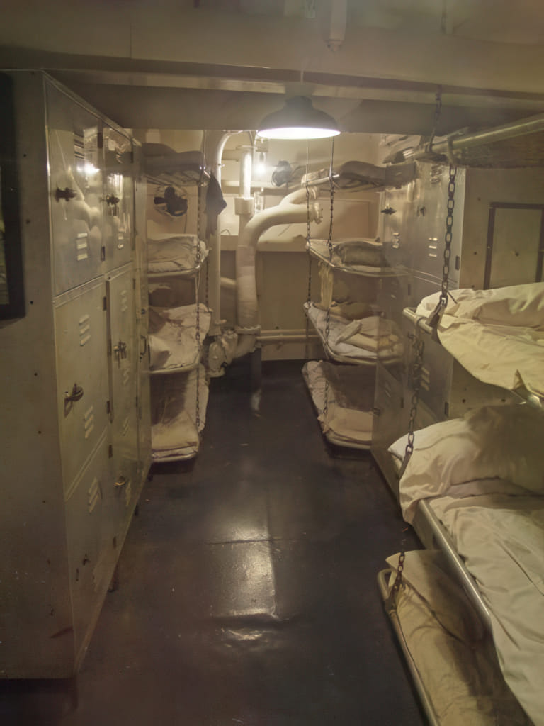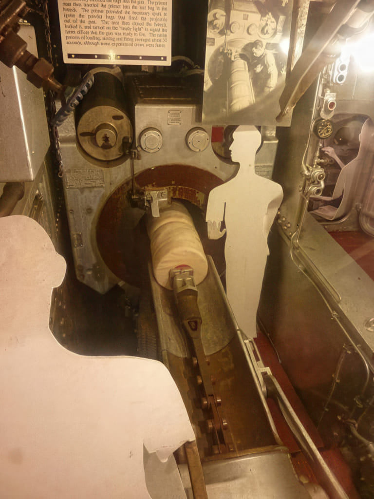 Nett bei dem schiff sind die Tafeln, mit Erinnerungen von ehemaligen Soldaten. Zum Beispiel sieht einer der Schiffdiesel so ganz normal aus, wenn man aber dazu liest, daß dieses Schiff besonders im warmen Pazifik eingesetzt wurde, die Dieselmotoren da unten gekocht haben und über die Lüftung 35°C Außenluft mit hoher Luftfeuchtigkeit eingeblasen wurde, dann kann man sich vorstellen, wie toll der Job da unten war: