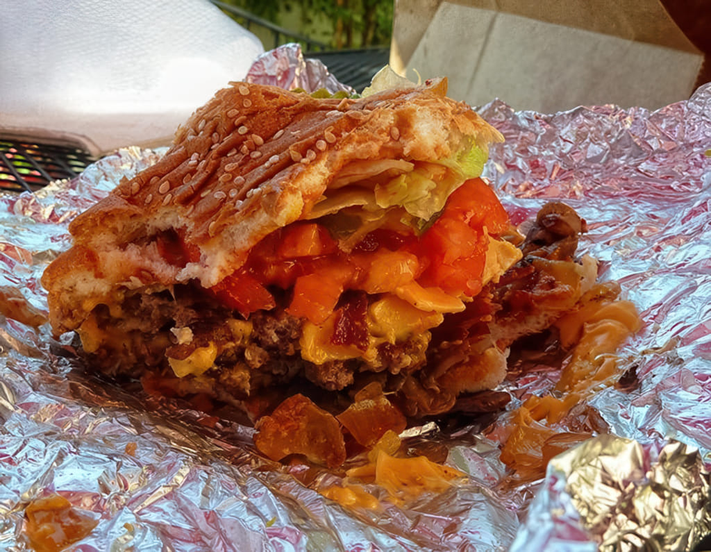 Das bun ist erschreckend labrig, dient aber bei der Fülle nur als eßbare Serviette. Die Füllung ist mehr als nur reichlich und garnicht schlecht. Mal etwas anderes, auch wenn ich in-n-out lieber habe.