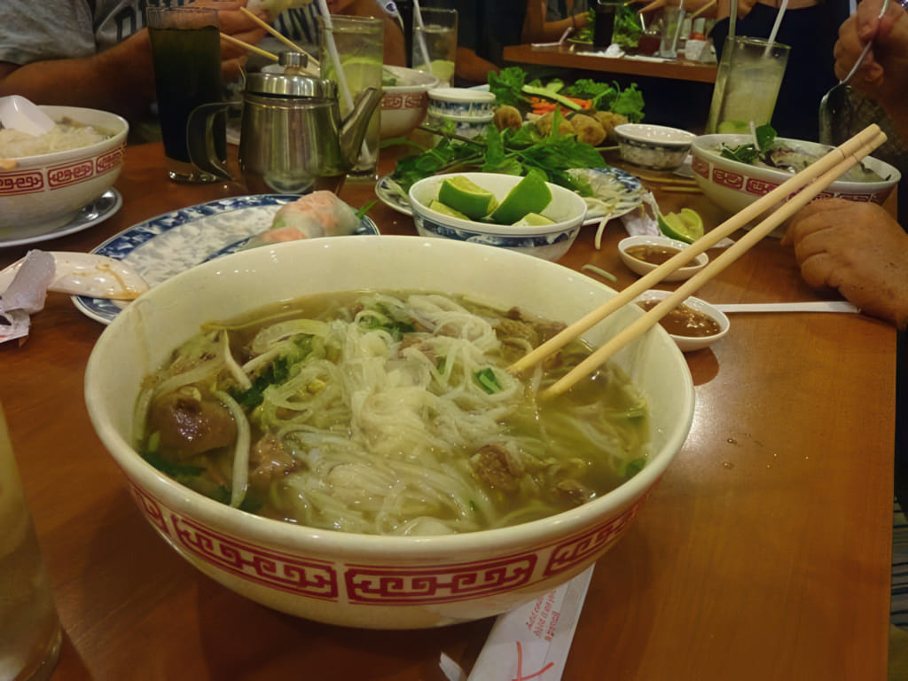 Danach ging es zum ersten mal in meinem Leben in ein Vietnamesisches Restaurant. Es wurde gewählt, weil es spät Nachts (das beginnt hier um 20 Uhr) noch offen hat. Das Pho So 1 in Gardena ist eine Suppenküche. Sowas hatte ich noch nicht, also flink getestet. Mein Ergebnis: Man glaube nicht, daß es sich dabei um eine Kleinigkeit zu Essen handelt. Die Frage Normalportion oder kleine Portion ist durchaus gerechtfertigt! Ich hatte Rindsuppe mit Rindfleischstücken, gesehen habe ich auch Hühnersuppe mit Hühnerstücken: