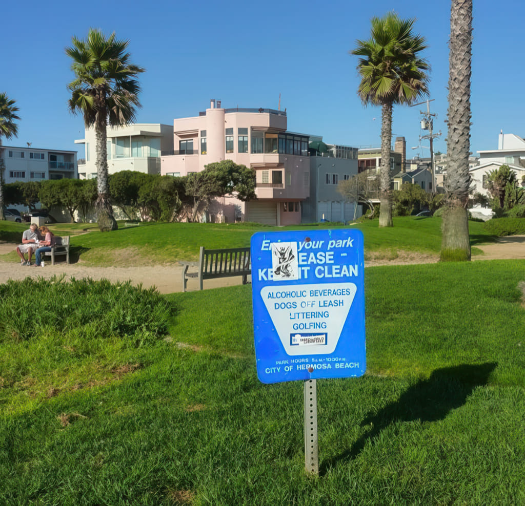 In Hermosa Beach (so heißt die Stadt!) gibt es einen Mikropark. Da sind einige Dinge verboten und das verstehe ich auch (Hunde müssen an die Leine, man darf keinen Dreck wegschmeißen oder sich zusaufen), aber wer kommt auf die Idee dort Golf zu spielen???