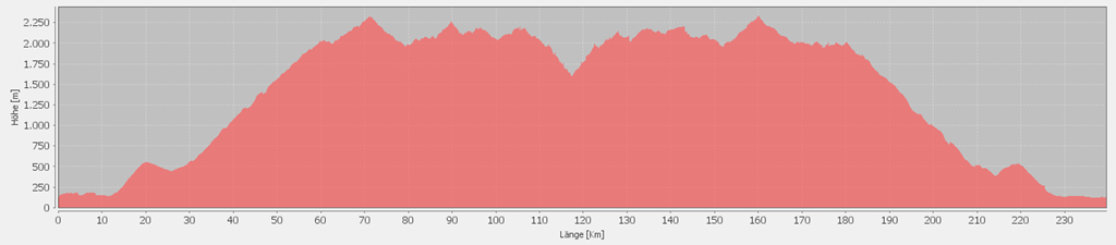 Die Straße geht leicht kurvig aber stetig den Berg an. Irgendwie müssen die guten 2000 Höhenmeter ja bezwungen werden: