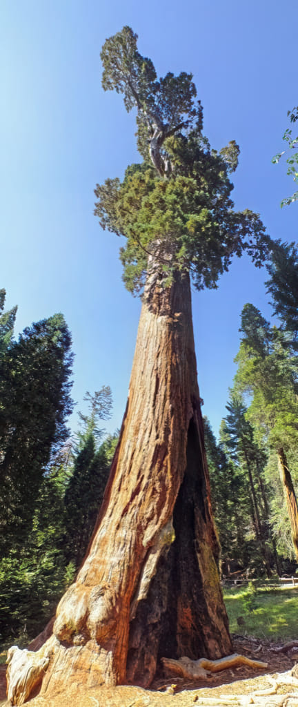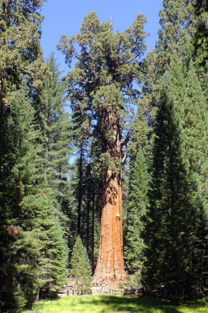 Im Sequoia NP gibt es gleich den größten Baum der Erde und da sind sie auch ganz stolz darauf. Größter Baum ist in dem Fall nicht auf die Höhe, sondern auf das Volumen gerechnet. Das Ding hat auch einen Namen, nämlich General Sherman (die ersten Parkranger waren noch Civil War Soldiers). Der Wipfel ist schon abgestorben und kann daher nicht mehr wachsen (höher wird das Ding somit nicht mehr), aber dicker wird er noch jedes Jahr! Die kleinen ‘Dreckflecken’ hinter dem Zaun beim Baum sind übrigens Menschen…