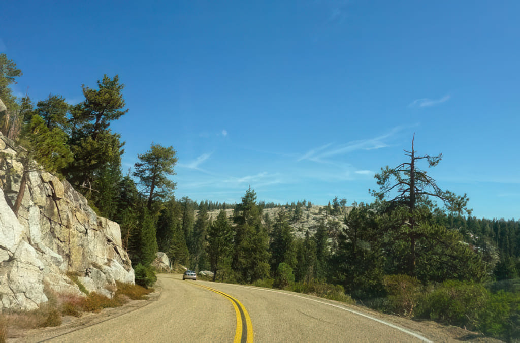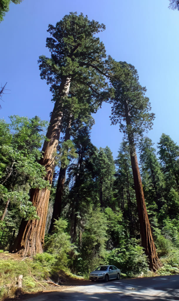 Die Straße zum liegenden Baum mit Tunnel für Autos drin war wegen dem Wochenende leider gesperrt, nur ein Busshuttle hätte dorthin geführt. Dazu müßte man aber parken. Nur ist der Parkplatz gleichzeitig der vom Sequoia-Museum und somit knackvoll. Also habe ich dieses Jahr darauf verzichtet und bin durch den Park der Riesen gefahren. Dort ist es viel ruhiger, denn da dürfen nur Autos bis 22ft Länge fahren, keine Busse und Wohnmobile. Hier mein gut 5m langes Auto vor ein paar Bäumen: