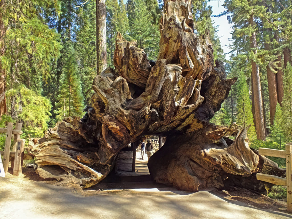 Am Nachmittag habe ich mich dann zurück in den Kings Canyon NP gewagt. Dabei habe ich auf die Stichstraße in den namensgebenden Canyon verzichtet, denn einerseits ist der Teil nur durchschnittlich spannend und andererseits wollte ich nicht zu spät zum Campingplatz zurückkommen. Damit blieb der 3. größte Baum der Welt (samt seinen umgebenden Nachbarn) noch übrig. Auf dem Weg dorthin sieht man einen umgefallenen Baum, der ausgehöhlt wurde um früher als Unterstand zu dienen. Heute leben dort die Wespen (vor denen gewarnt wird):