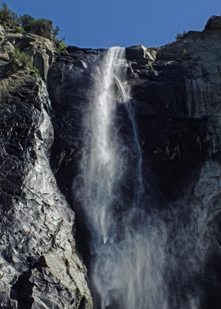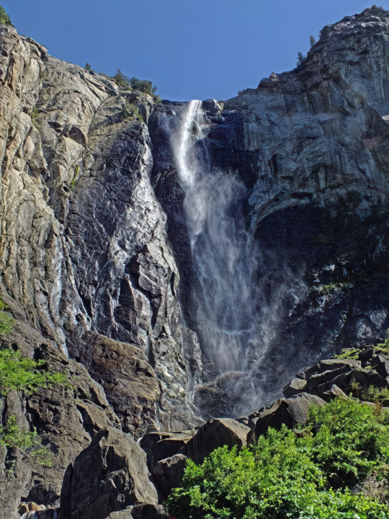 Kaum im Tal angekommen sollte man sich auf die kleine Stichstraße zum Bridalveil Fall werfen. Die Parkplatzsuche kann zur Qual werden, ich hatte aber Glück (ich mag mir nicht ausmalen, wie es am Wochenende war). Nach ein paar wenigen Metern auf einem Weg kommt man ziemlich in die Nähe des Falles. Unten kommt kaum mehr Wasser an, mehr Nebel, der sich wieder zu Wasser zusammenfindet. Trotzdem ist es dieses Jahr sehr naß, ich hatte schon Besuche, da kam unten garkein Wasser mehr an.