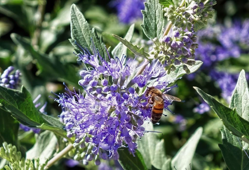 Die blühenden Büsche in der Parkanlage locken Bienen an. Keine Ahnung wo die da wohnen:
