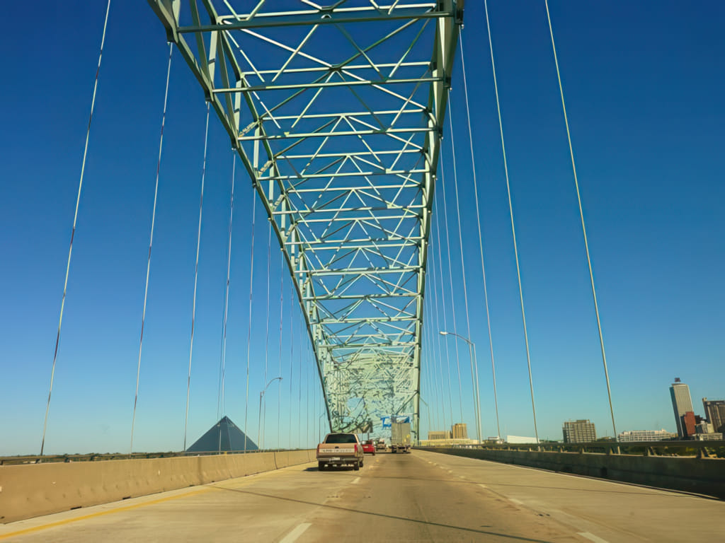 Da wir Memphis recht früh erreichten, habe ich noch gute 2 Stunden angehängt und bin bis zum nächsten Campingplatz gefahren. Damit sollte sich am nächsten Tag neben dem Fahren noch eine Besichtigung ausgehen. Hier die Brücke nach Memphis (und damit die Stateline zu Tennessee):