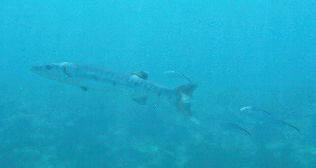 Gestern habe ich gemeint, besser kann es nicht werden. Das war eigentlich rhetorisch gemeint, aber irgendwer hat das wohl als Herausforderung gesehen. Heute war es deutlich wolkiger als gestern (die Wolken waren aber erst für morgen angesagt – hängt ihn höher, den Wettermann) und ganz leichte Wellen zierten das Meer. Die Fahrt zum Looe Key war nicht anders, ein wenig schaukeliger halt. Die Delphine wurden schon beim Rausfahren gesichtet, bessere Fotos habe ich trotzdem nicht. Beim Ins-Wasserhüpfen die herbe Enttäuschung: Die Sichtweite hat sich halbiert (obwohl auch der Kapitän von gleichen Bedingungen wie am Vortag sprach) und die Quallen waren wieder da. Die aber in einer noch nicht geahnten Konzentration: Es war wie in einem Minenfeld schwimmen. Zudem hat der gleiche Kapitän wie am Vortag einen anderen Bojenplatz genommen und der war einfach unbrauchbar. Erst 20 Minuten nach dem Wassern kam ich zum ersten Bild, kaum Fische und kaum geeignete Stellen. Man sieht gleich, daß das Wasser nicht so klar ist, dem Barrakuda ist das aber egal: