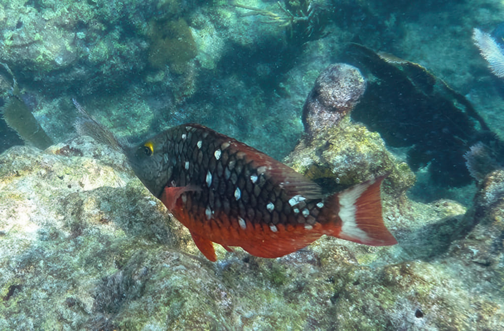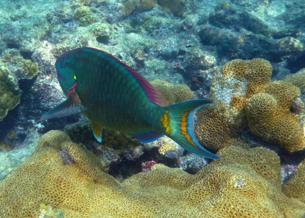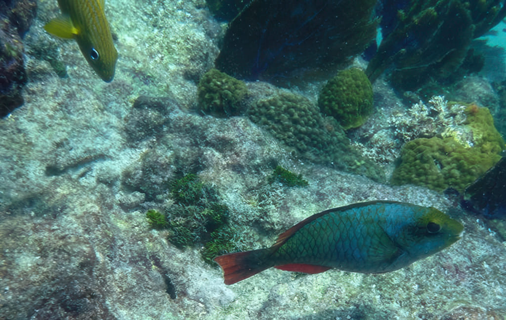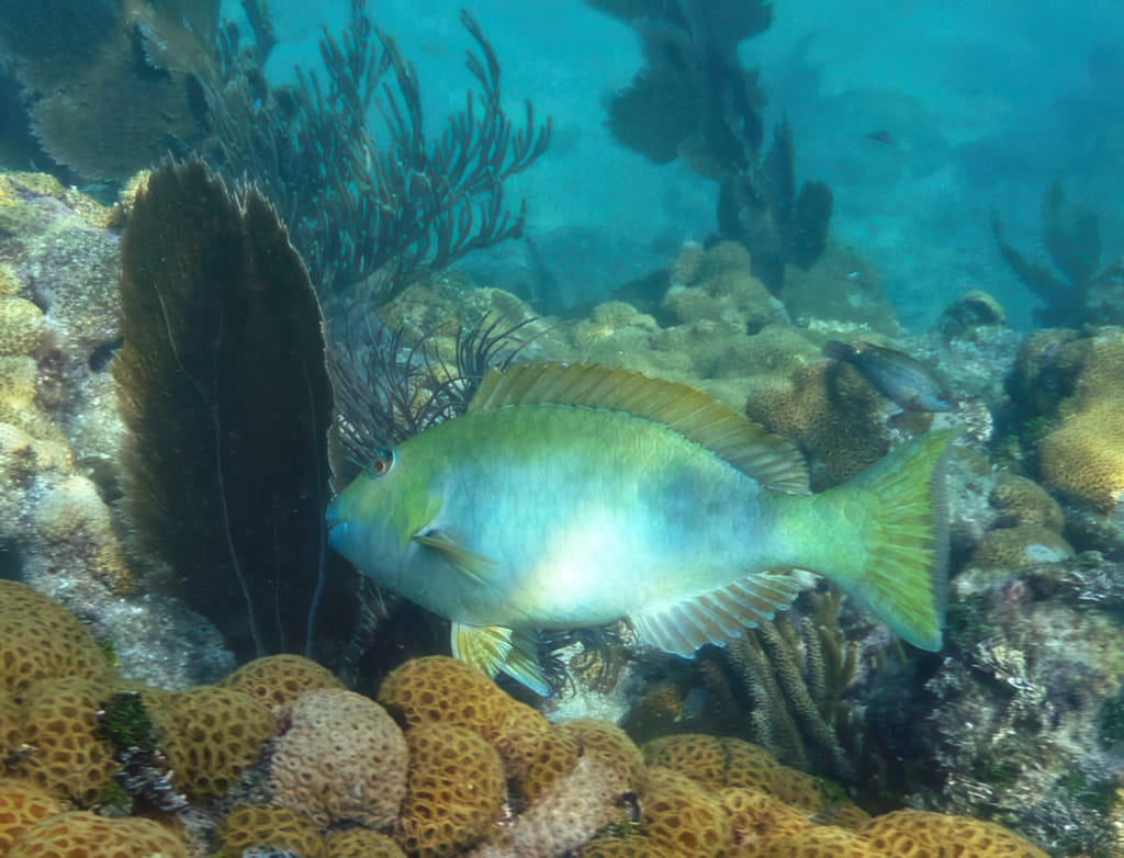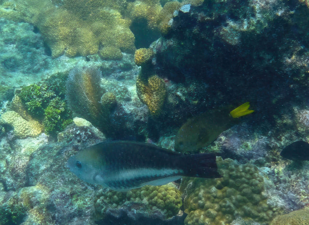 Mit der Zeit wurde die Sicht wieder etwas besser, die Quallen deutlich weniger. Da war wohl eine ungünstige Strömung am werken. Zu viel Key West Wasser? Stopptafel-Papageienfische sind jedenfalls immer dankbare Motive: