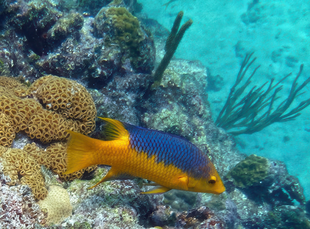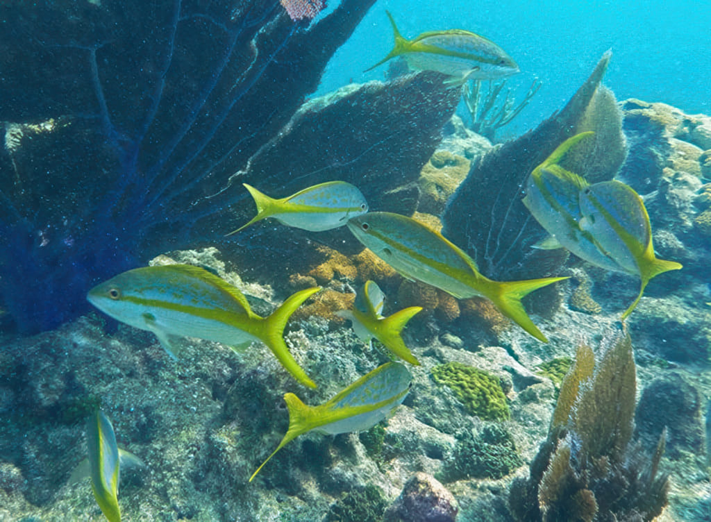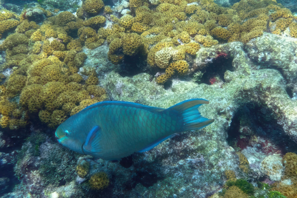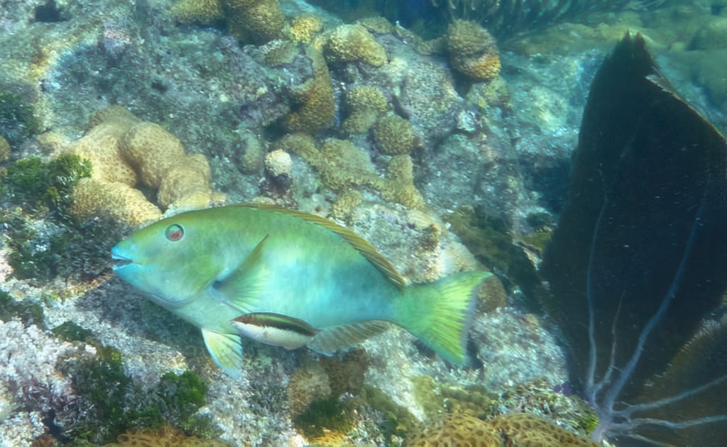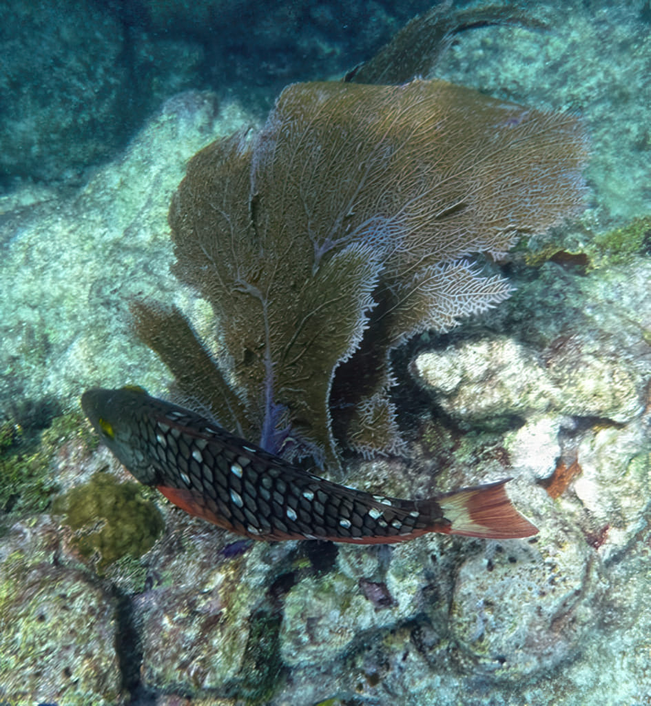 Mit der Zeit wurde die Sicht wieder etwas besser, die Quallen deutlich weniger. Da war wohl eine ungünstige Strömung am werken. Zu viel Key West Wasser? Stopptafel-Papageienfische sind jedenfalls immer dankbare Motive: