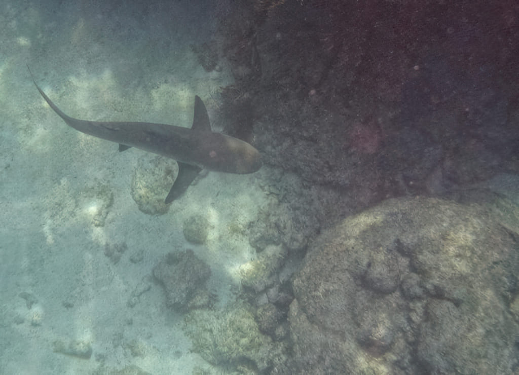 In einem sandigen Graben zwischen den Korallen schwamm ein kleiner Hai flott dahin. Dieses mal habe ich wenigstens ein Foto davon:
